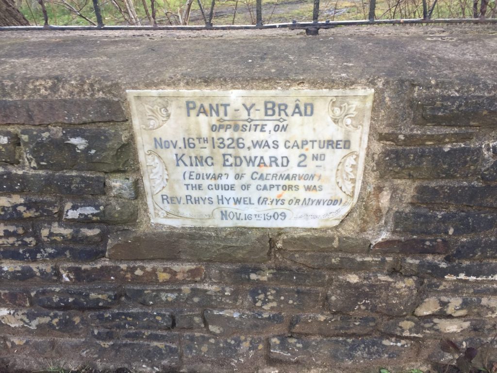Over a surprisingly substantial stone bridge we turned left onto the track of a railway which we thought might have been the same mineral railway which crosses Llantrisant common. Time was running on so we used a convenient four seater fallen tree to have our picnic lunch. A large pig at the foot of the railway embankment watched as we continued along the track, emerging eventually at Pant y Brad, “hollow of the traitors”, where a plaque in the wall commemorates the capture of the unfortunate Edward II after being chased around the country by the forces of his wife, the awful Isabella “the she wolf of France”, and her paramour Roger Mortimer. Another path took us downhill then left to Tonyrefail. Up some steps we entered a housing estate where Google Maps took us to the bus stop and a 40 minute ride back to Groes Faen.
