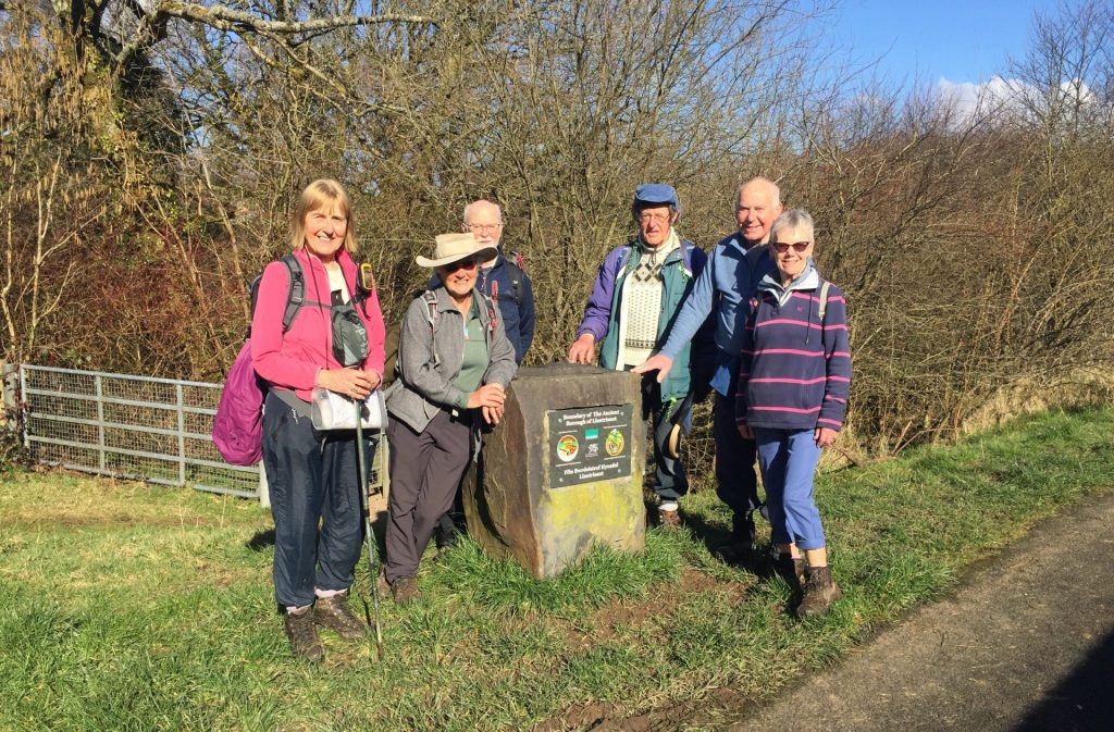 At another boundary stone we turned off the road through woods and over extremely muddy fields until we came to one with a number of well-grown calves. Not all of us care for walking through stock any bigger than a sheep, however one of our members is a fan of cows and persuaded us to walk through them, which we all survived. Through more thick mud we reached another road which took us to a turning to Treferig where there are the remains of a 17th century Quaker meeting house.